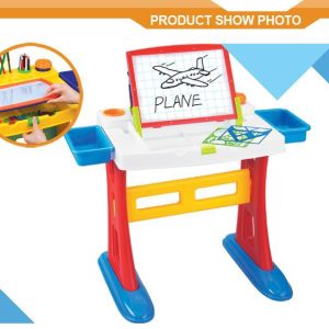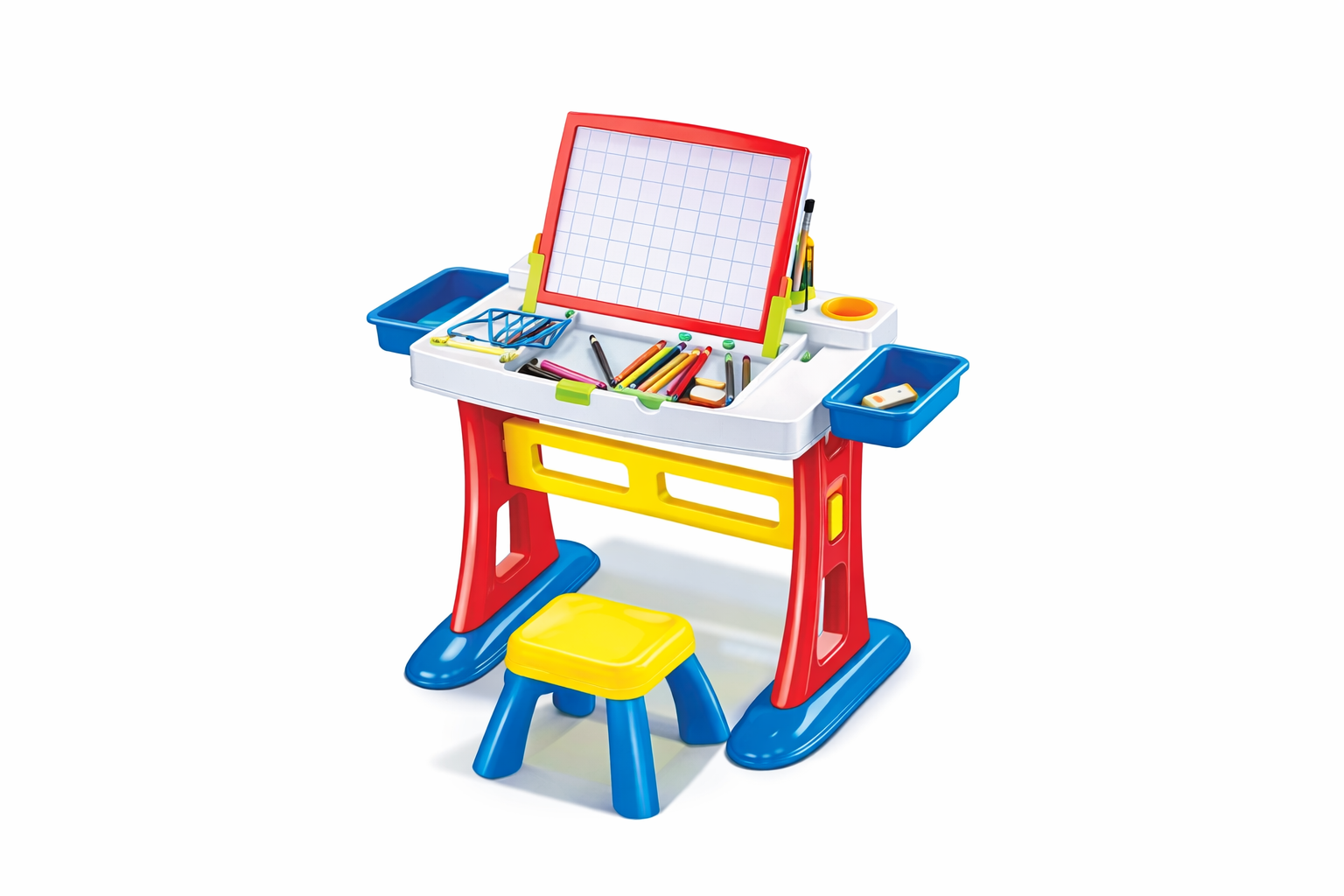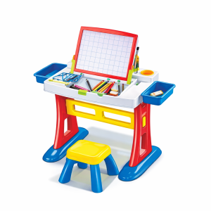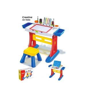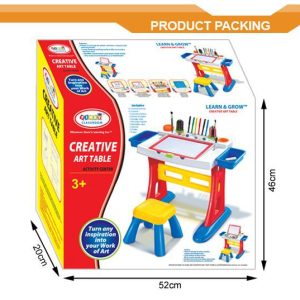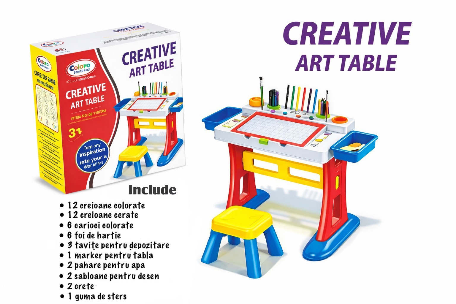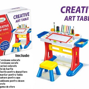Tablita de desenat si pupitru birou Creative Art Table este o tabla de desen cu doua fete. Copiii pot scrie si desena cu creta sau creioane colorate furnizate. De asemenea, pot picta pe hartie prinsa pe tabla. Orice copil poate sa stea sa scrie si sa deseneze pe ambele parti ale tablitei, iar aceasta poate fi folosita in pozitie de stand sau culcat. Dupa terminarea utilizarii, copiii pot pastra cu usurinta toate materialele in sertarul din masa si il pot inchide. Datorita designului sau ergonomic, masa Creative Art Table este potrivita pentru copiii de la 3 ani.