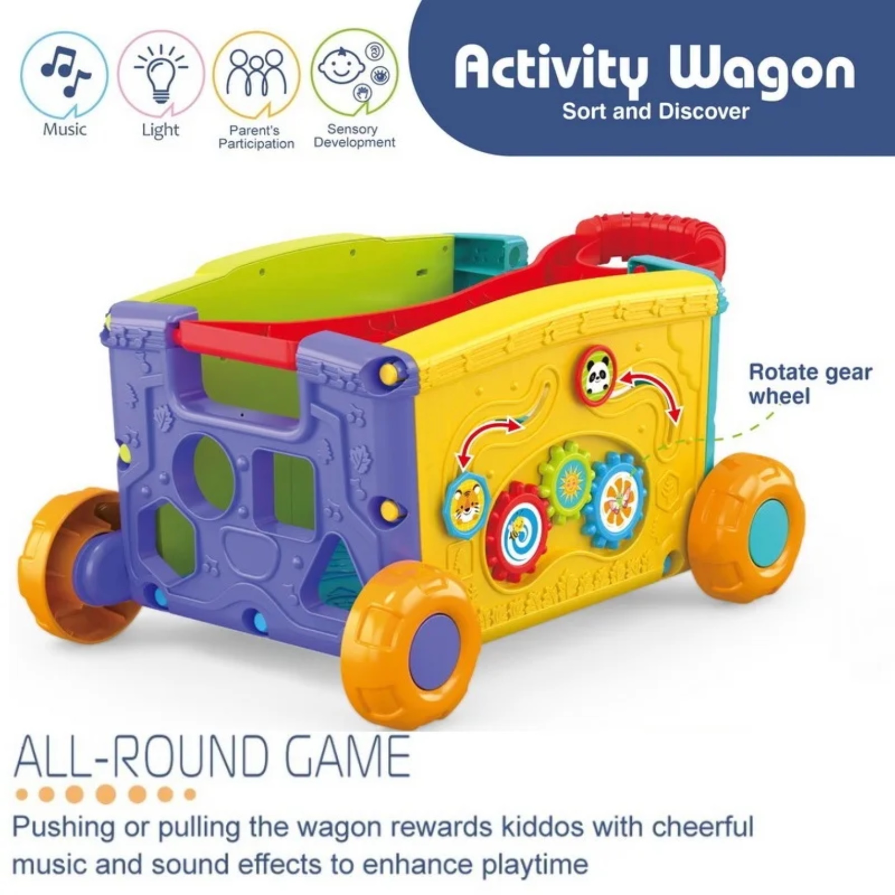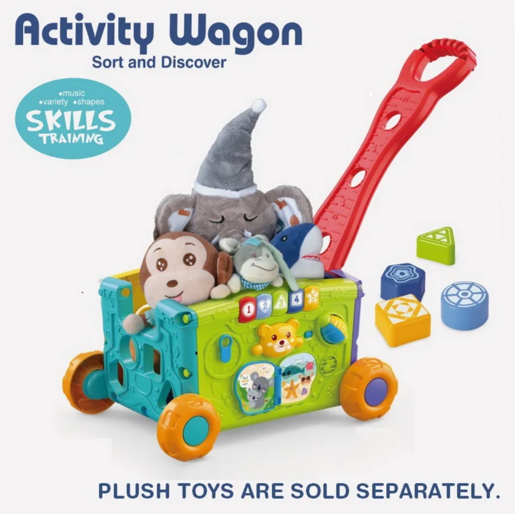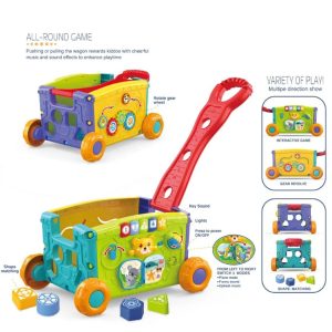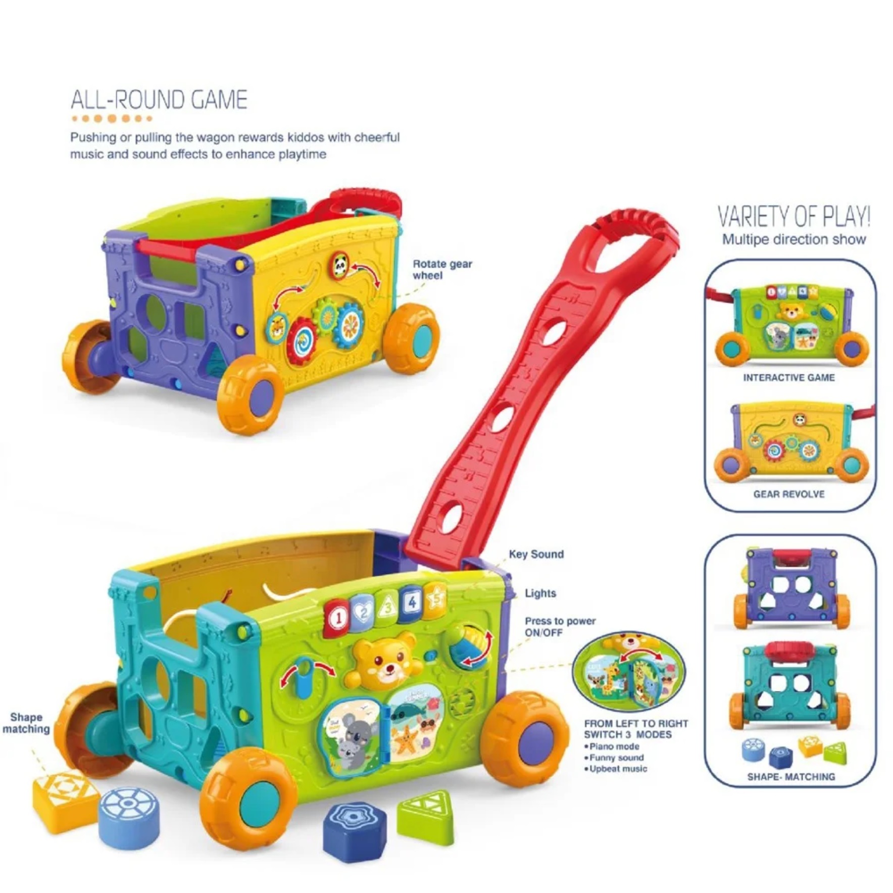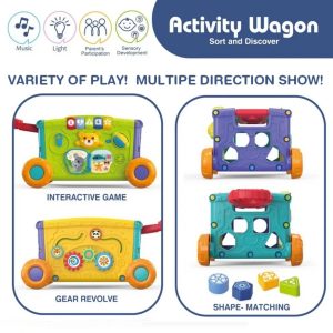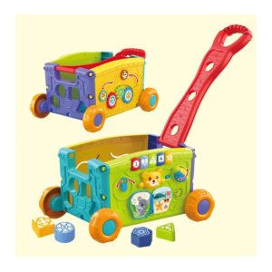 Un cărucior plin de minuni! Fiecare parte conține activități precum sortarea formelor, roți dințate, butoane numerotate cu sunete, labirinturi, carticica cu animale salbatice și multe altele. Adună jucării și obiecte preferate pe care micii aventurieri le pot lua cu ei în timp ce se joaca și explorează. Împingerea sau tragerea căruciorului îi recompensează pe copii cu muzică veselă și efecte sonore pentru a îmbunătăți timpul de joacă. Îndoiți mânerul pentru o depozitare ușoară sau pentru a vă juca cu rotițele colorate, adăugând o a cincea latură bonus căruciorului! Este prevăzut cu multiple activități care stimulează coordonarea, gândirea logică și simțurile copilului.Destinat copiilor cu vârsta cuprinsă între 12 și 36 de luni; necesită 2 baterii AA; bateriile noi sunt recomandate pentru utilizare regulată.