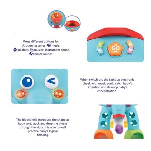 Centrul de activitati sub forma de elefant propune celor mici mai multe variante de invatare prin joaca, fiind un bun prieten in dezvoltarea fizica si mentala a acestora inca de la cele mai fragede varste.