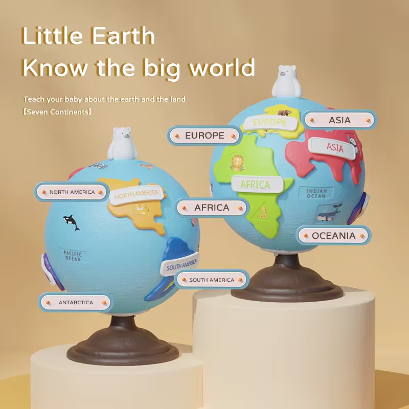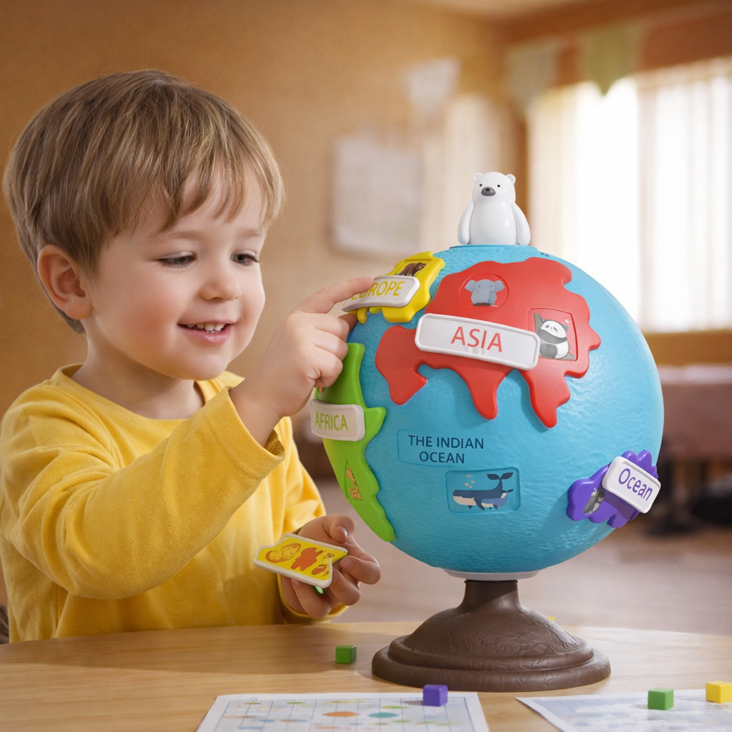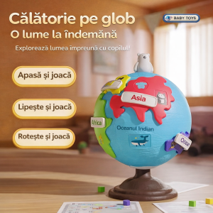 Copiii pot potrivi piesele cu continentele, pot roti globul si pot descoperi animale specifice fiecarei regiuni. Aceasta jucarie stimuleaza imaginatia, curiozitatea si dezvoltarea cognitiva.