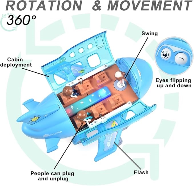 Unul dintre cele mai atractive aspecte ale avionului cu pasageri este efectul de lumină și sunet. Atunci când este activat, avionul luminează și emite sunete specifice unui zbor real. Luminile sunt plasate în zonele cheie ale avionului, cum ar fi farurile și iluminatul interior, adăugând un efect vizual deosebit de captivant. Luminile intermitente imită exact cum ar arăta un avion în timpul unui zbor pe timp de noapte, făcând jocul și mai autentic și mai interesant.