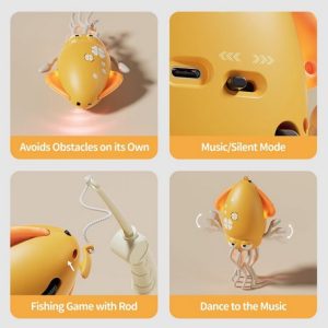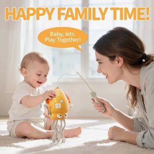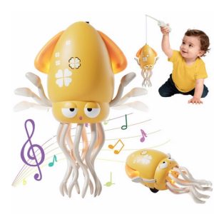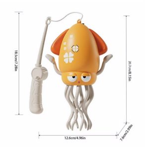 Copilul încearcă să prindă caracatița cu undița magnetică inclusă, dar ea dansează, luminează și cântă – provocând râsete și mișcare!