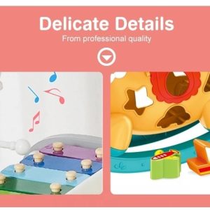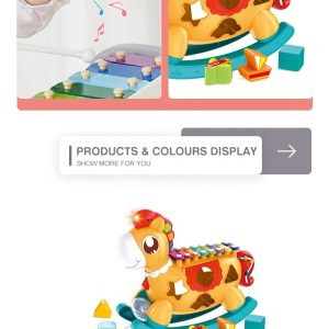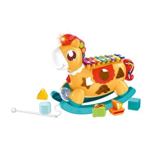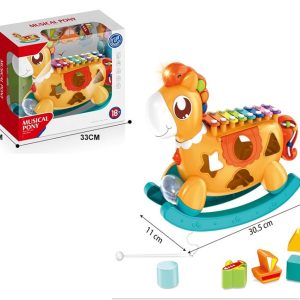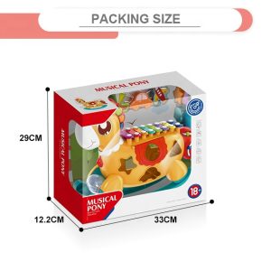 Jucarie interactiva ponei cu xilofon si sortator este un instrument muzical de percutie, adaptat pentru distractia celor mici le va oferi acestora o prima introducere in lumea muzicala dar si ocazia sa exerseze gama notelor muzicale cat si multe alte ritmuri proprii.