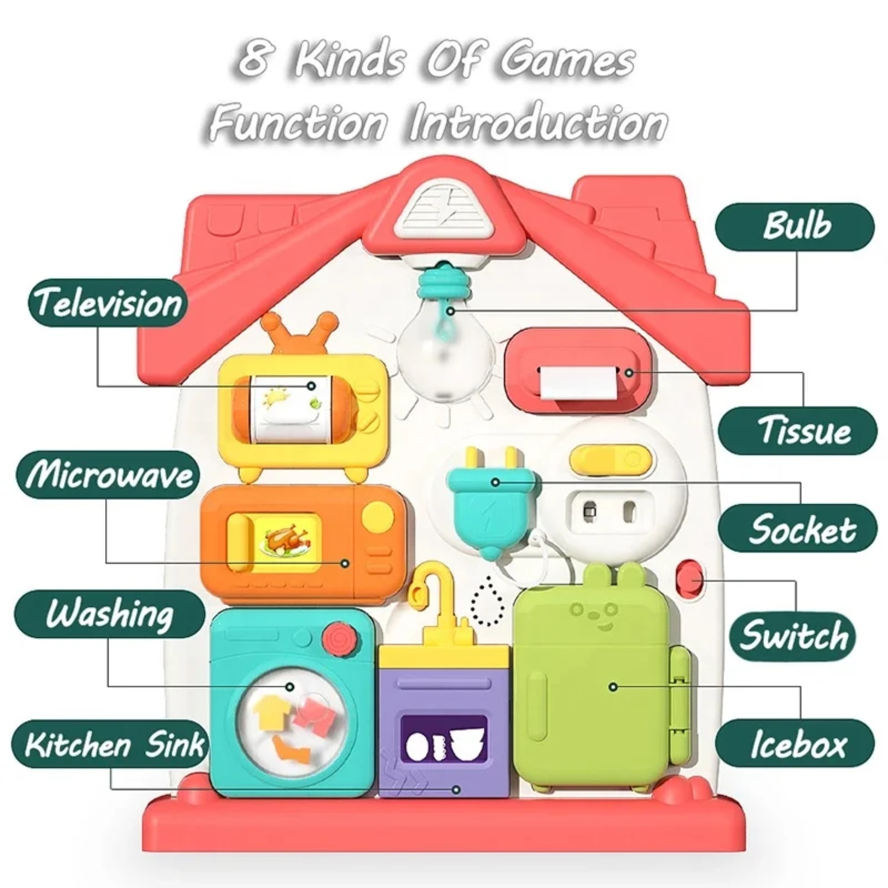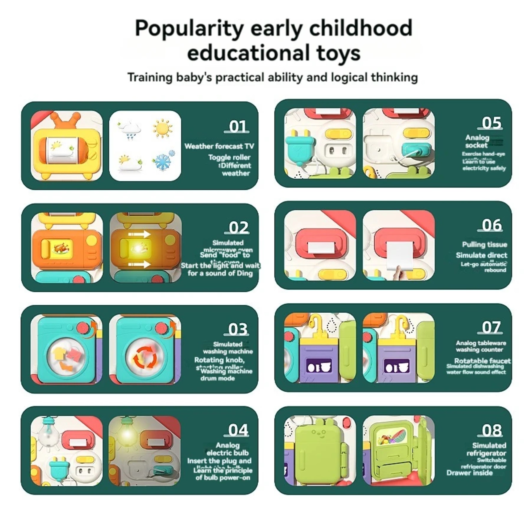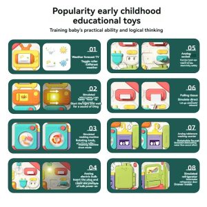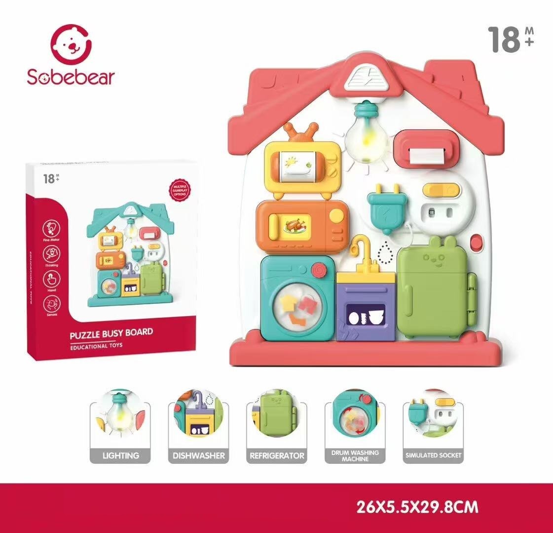 O jucarie interactiva cu activitati educative pentru copii conceputa pentru a dezvolta abilitatile motrice fine. O jucarie Montessori captivanta multifunctionala,cu moduri diferite de joaca. Vor face exercitii pentru a identifica rolul diferitelor obiecte de pe panou.