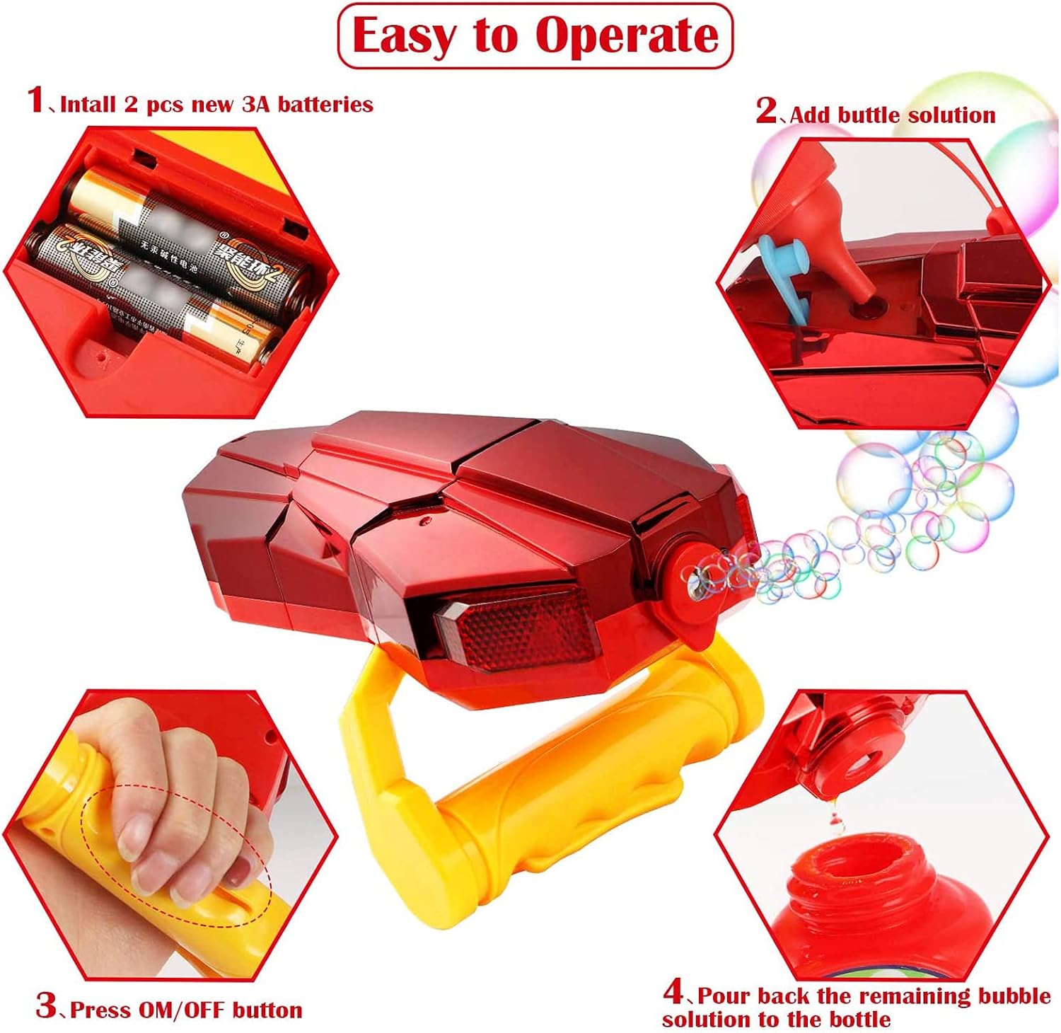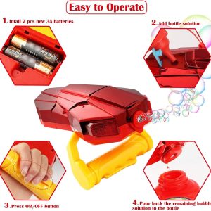 Extrem de usor de utilizat, acesta asigura distractie nelimitata tuturor, indiferent de varsta.Toarna lichidul pentru baloane in recipientul inclus, ,,incarca” jucaria, apasa pe buton si… asta e tot! Transforma petrecerile copiilor tai in experiente de neuitat!