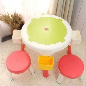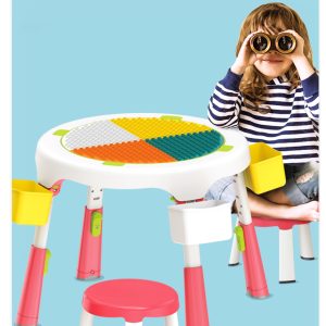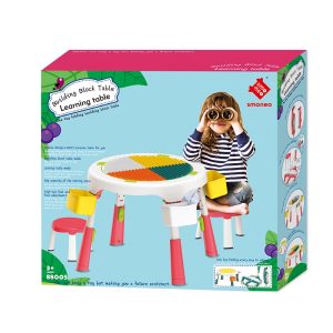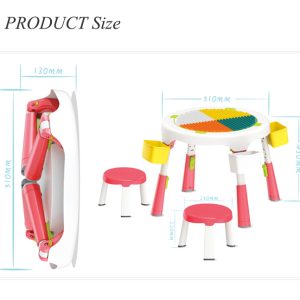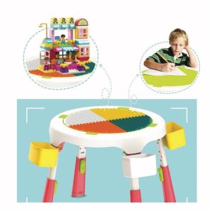 Masa compatibila Lego pliabila cu 2 scaune incluse pentru copii , cu multiple functii: o suprafata a mesei are profil tip Lego pe care se pot fixa si construi , cealalta fata a mesei este neteda pentru scris, colorat etc, in interior spatiu de depozitare modular (pentru piese Lego, creioane, carti etc)