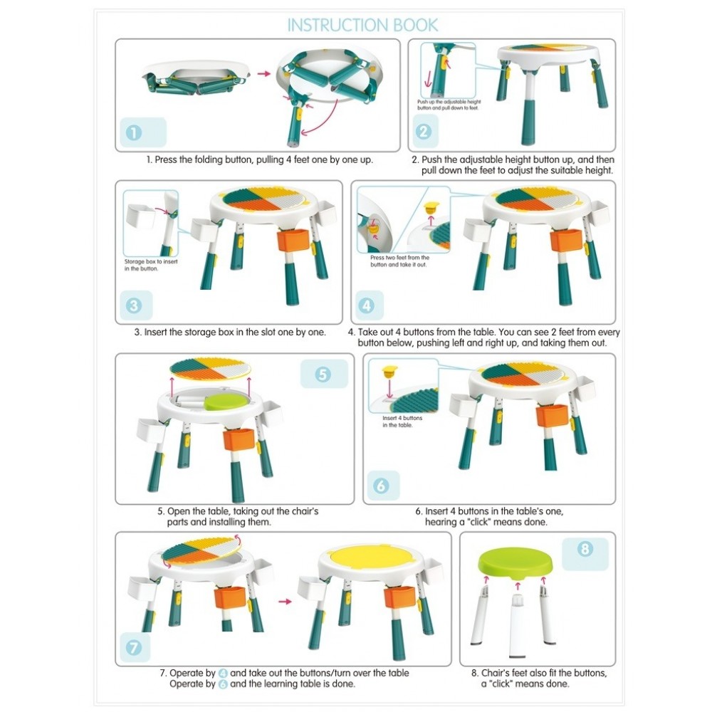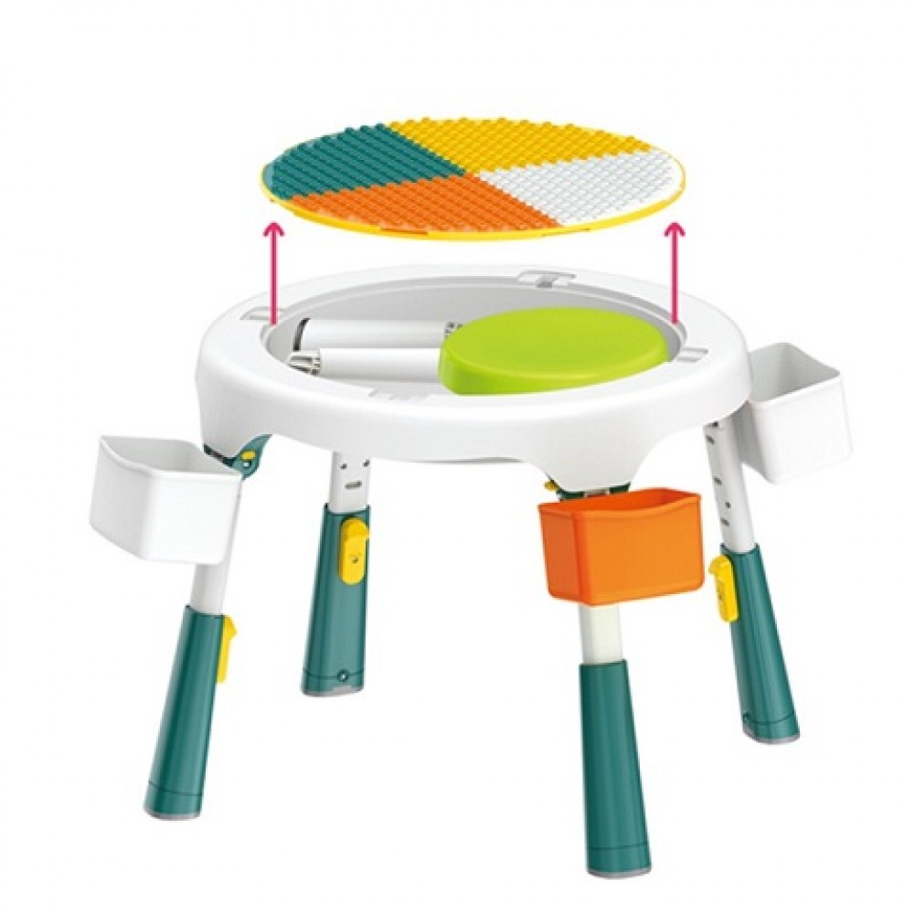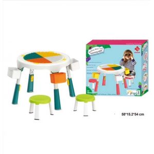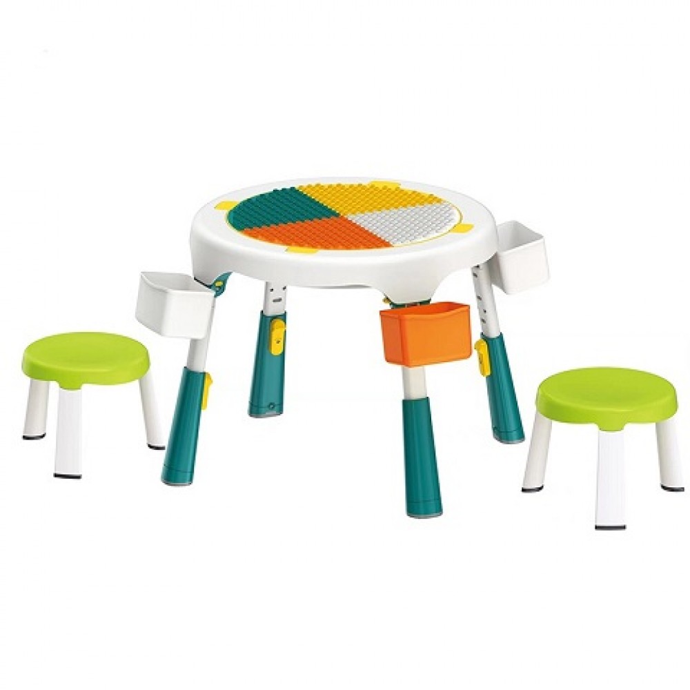 Masa compatibila Lego pliabila cu 2 scaune incluse pentru copii , cu multiple functii: o suprafata a mesei are profil tip Lego pe care se pot fixa si construi , cealalta fata a mesei este neteda pentru scris, colorat etc, in interior spatiu de depozitare modular (pentru piese Lego, creioane, carti etc)