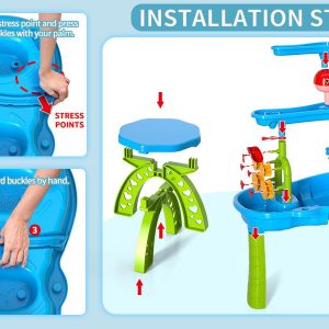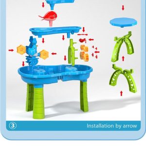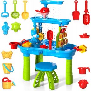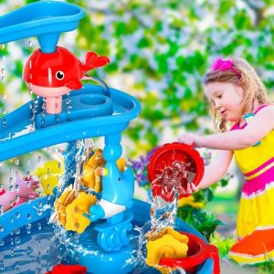 Aceasta masa cu dimensiuni generoase (32,6″x25″x16,5″) pentru copii mici va crea un mini parc acvatic in curtea ta sau la plaja. Design-ul este pe trei niveluri, iar apa care curge creeaza efectul de ploaie; este dotata cu numeroase accesorii ceea ce permite copilului tau se sa joace cu prietenii sai incurajand socializarea .