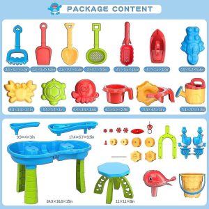 Setul contine lopetica,grebla,sita pentru nisip,galetusa,stropitoare,diferite forme pentru nisip,masuta cu trei nivele,scaun,jucarii plutitoare(barcuta),obiecte decorative(floare,balena),un sistem de roti actionat de curgerea de apa.