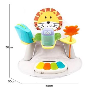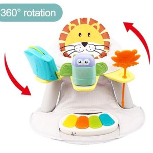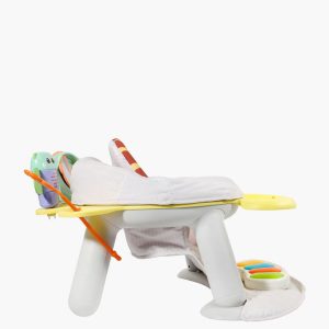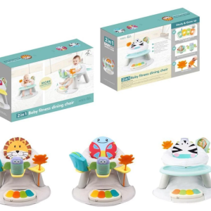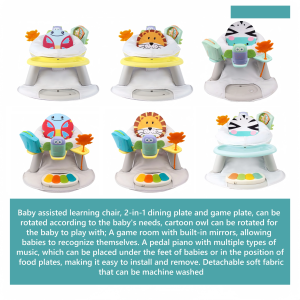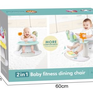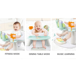 Se transforma cu usurinta dintr-un set de masa intr-un scaun confortabil in care copilul se poate juca prin simpla rotire la 360 grade.La baza are o jucarie muzicala cu clape pe care copilul o poate lovi cu piciorusele, o jucarie din cauciuc moale in forma de broscuta, o bufnita care se roteste.Poate inlocui cu succes scaunul de masa clasic, fiind ideal atat pentru utilizare cotidiana cat si in deplasare.