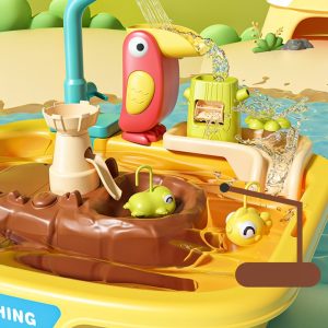 Lasati copilul sa pescuiasca ca niste pescari adevarati! Jocul contine tot ce au nevoie cei mici pentru a experimenta pescuitul profesionist. Copiii pot prinde pestisorii cu undita si cu plasa, fapt care le dezvolta dexteritatea si ii invata rabdarea. Orientati robinetul catre palnia sub forma de papagal iar apa care curge va pune in miscare morisca de apa.In mijlocul bazinului se afla o insula in jurul careia inoata pestisorii.Cu figurine de diferite culori si forme, le trezeste interesul chiar si al celor mai mici copii.