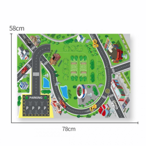 Setul include garajul, 2 mașini, un elicopter și un covor cu un oraș.