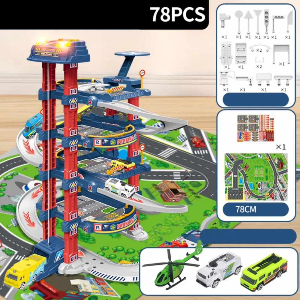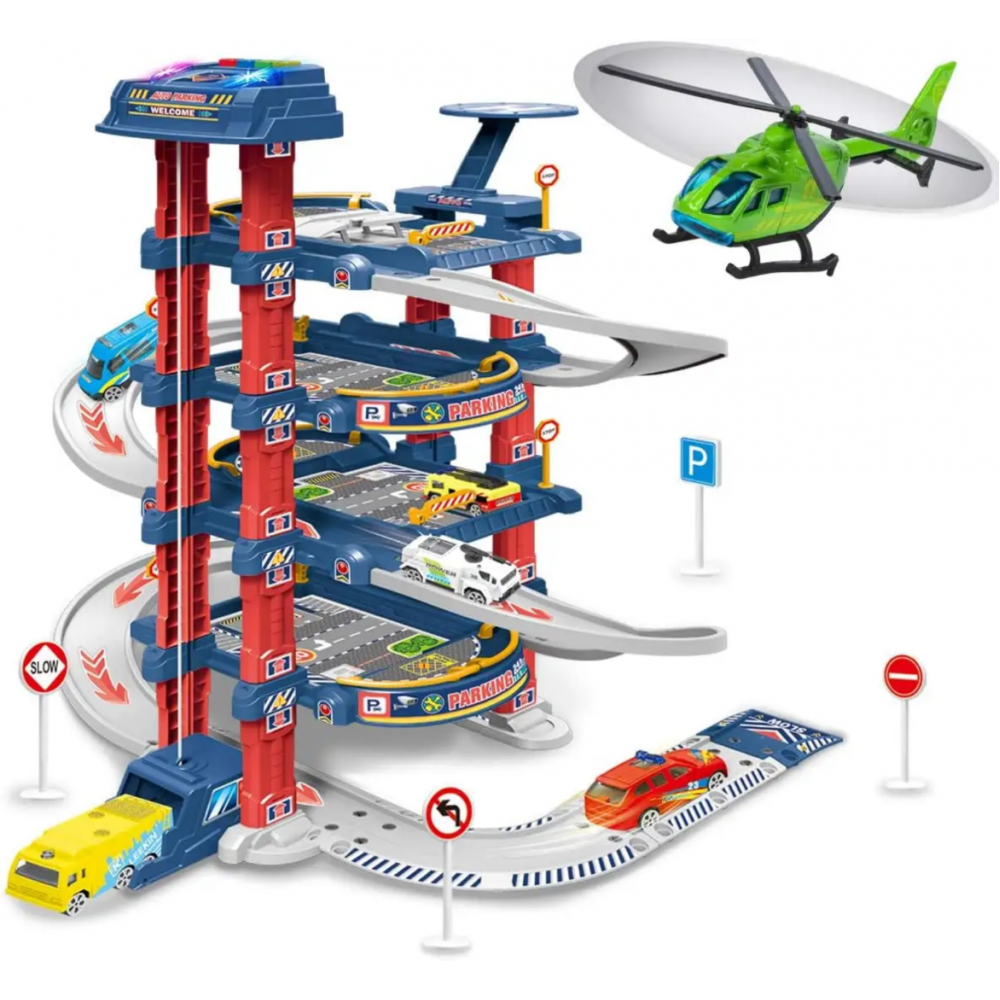 Parcare etajata cu sunete si lumini pe 4 nivele cu ascensor, loc special amenajat pentru aterizarea elicopterelor cu 2 masinute si un elicopter, este cadoul ideal pentru cei mici interesati de automobile si elicoptere.