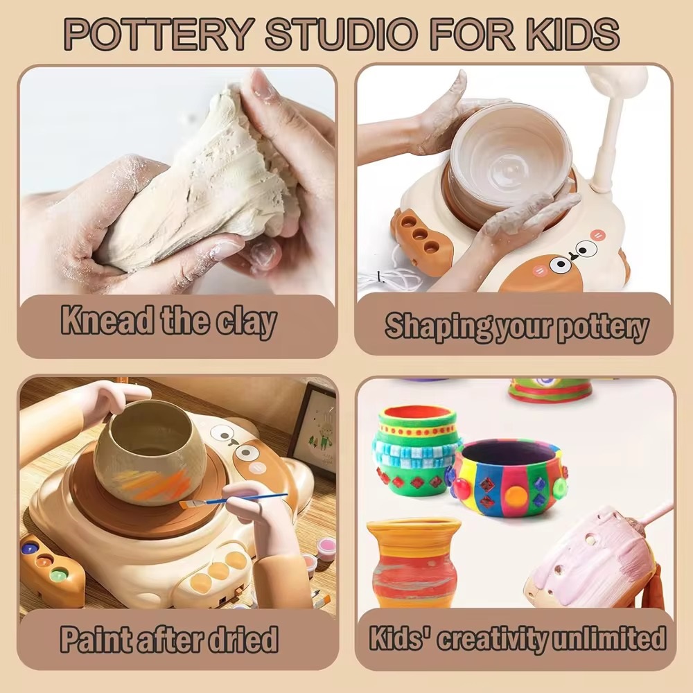 Acest kit de olărit pentru copii include tot ce este necesar pentru a crea proiecte distractive din lut. Conține o mini roată electrică de olărit cu un design drăguț în formă de pisică, unelte pentru sculptare, fir de tăiere, 3 pachete de lut cu uscare la aer, 12 culori de vopsea, 2 pensule, un șorț, o pedală și o lampă. Copiii pot modela și decora cu ușurință propriile opere de artă folosind acest set complet.